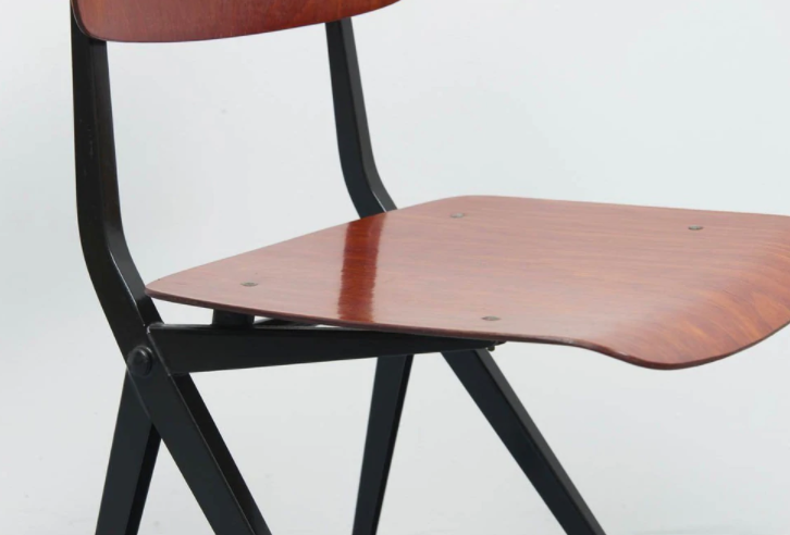 Chaises du designer hollandais Friso Kramer. Modèle Result. Structure en métal plié et laqué en forme de compas qui supporte une assise et un dossier en contreplaqué moulé et vernis.